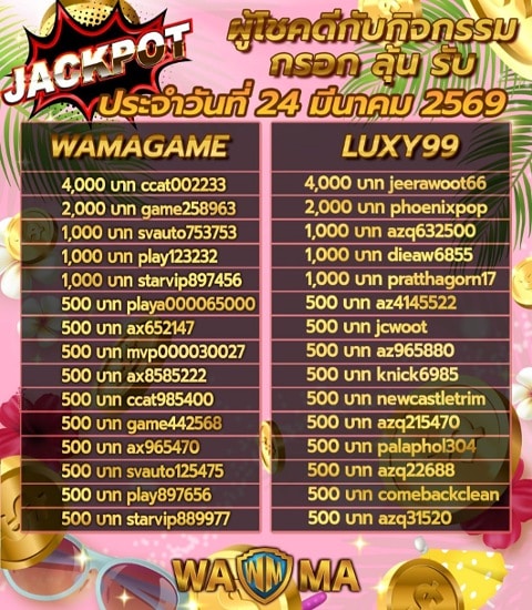 - สมัครเล่นคาสิโน WamaGame , 918Kiss และ Luxy99 แล้วรับสิทธิ์ลุ้นรางวัล ลุ้นรางวัลคืนกำไรกันได้ทุกวัน เพียงกรอกข้อมูลลงทะเบียนใช้สิทธิ์กับเรา ชิงโชครายวัน