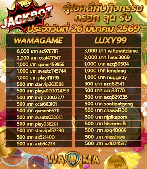 - สมัครเล่นคาสิโน WamaGame , 918Kiss และ Luxy99 แล้วรับสิทธิ์ลุ้นรางวัล ลุ้นรางวัลคืนกำไรกันได้ทุกวัน เพียงกรอกข้อมูลลงทะเบียนใช้สิทธิ์กับเรา ชิงโชครายวัน
